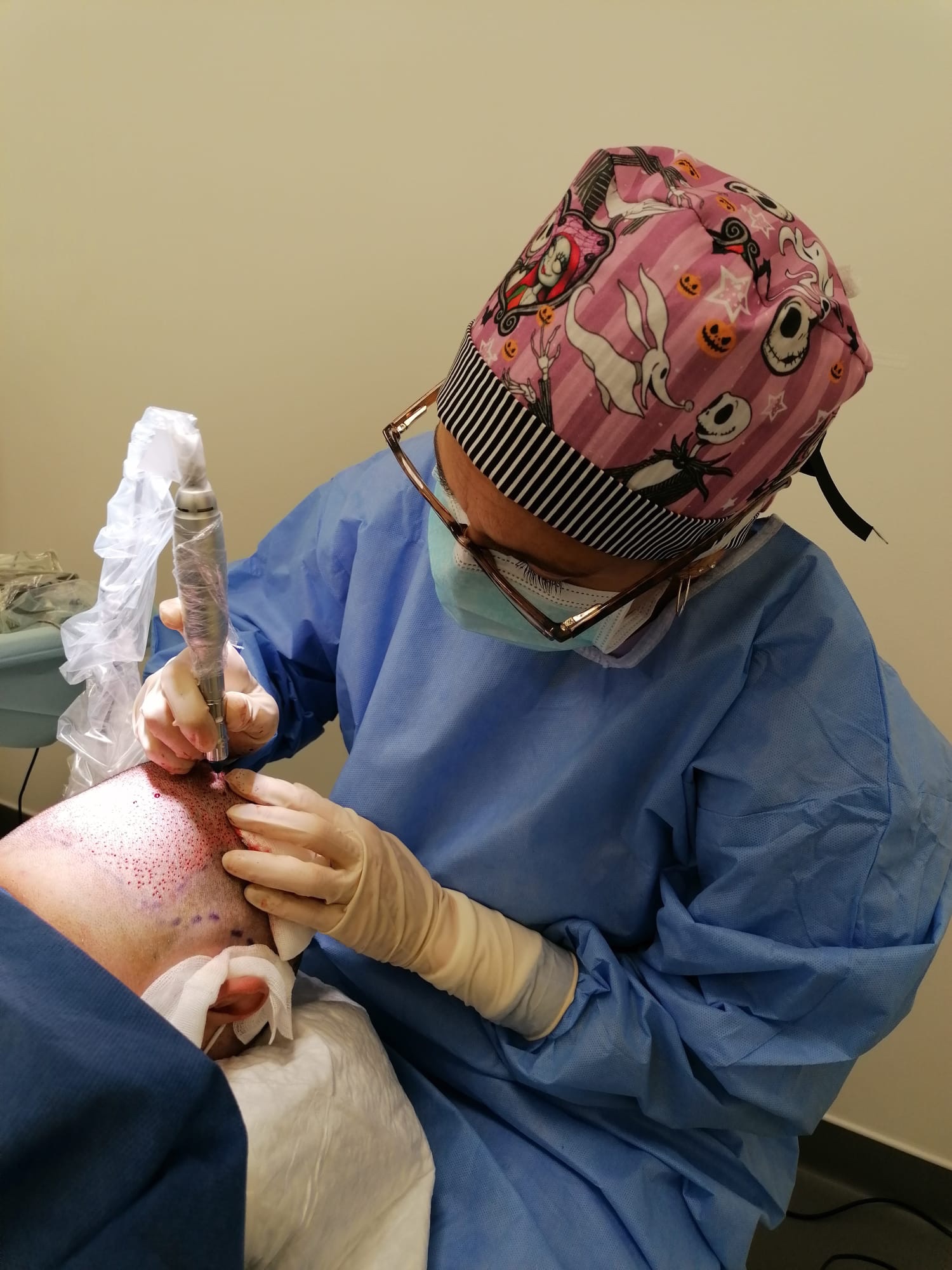 O passo essencial do transplante capilar FUE, no qual a zona recetora é anestesiada e todas as unidades foliculares são colocadas. Este procedimento é feito com o auxílio de vários instrumentos especializados, chamados “implantadores”.