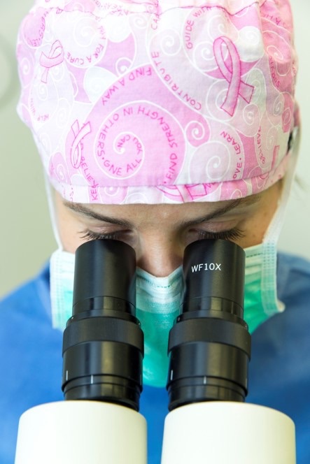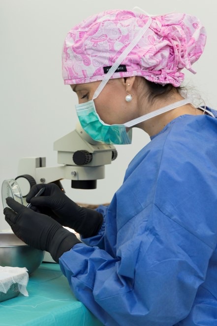A preparação das unidades foliculares para o transplante capilar FUE é feita por um elemento da equipa médica com o auxílio de um microscópio estereoscópio que permite a realização de um trabalho cuidado e minucioso.